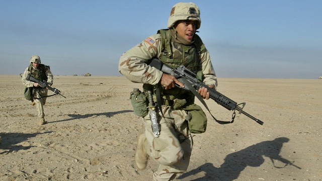 U.S Marines run during a training excercise in the Kuwaiti desert near the Iraqi border Friday, Dec. 20, 2002. Hundreds of troops from the Charly company, 15th infantry regiment, have set up a command center in the desert of Kuwait. About 12,000 troops, including more than 7,000 Army soldiers, are deployed in the desert at multiple army and Air Force bases. (AP Photo/Anja Niedringhaus)